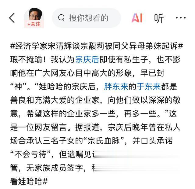 他还认为,富豪有私生子很正常的行为,瑕不掩瑜,不会影响宗老在网友心目中的高大形象。